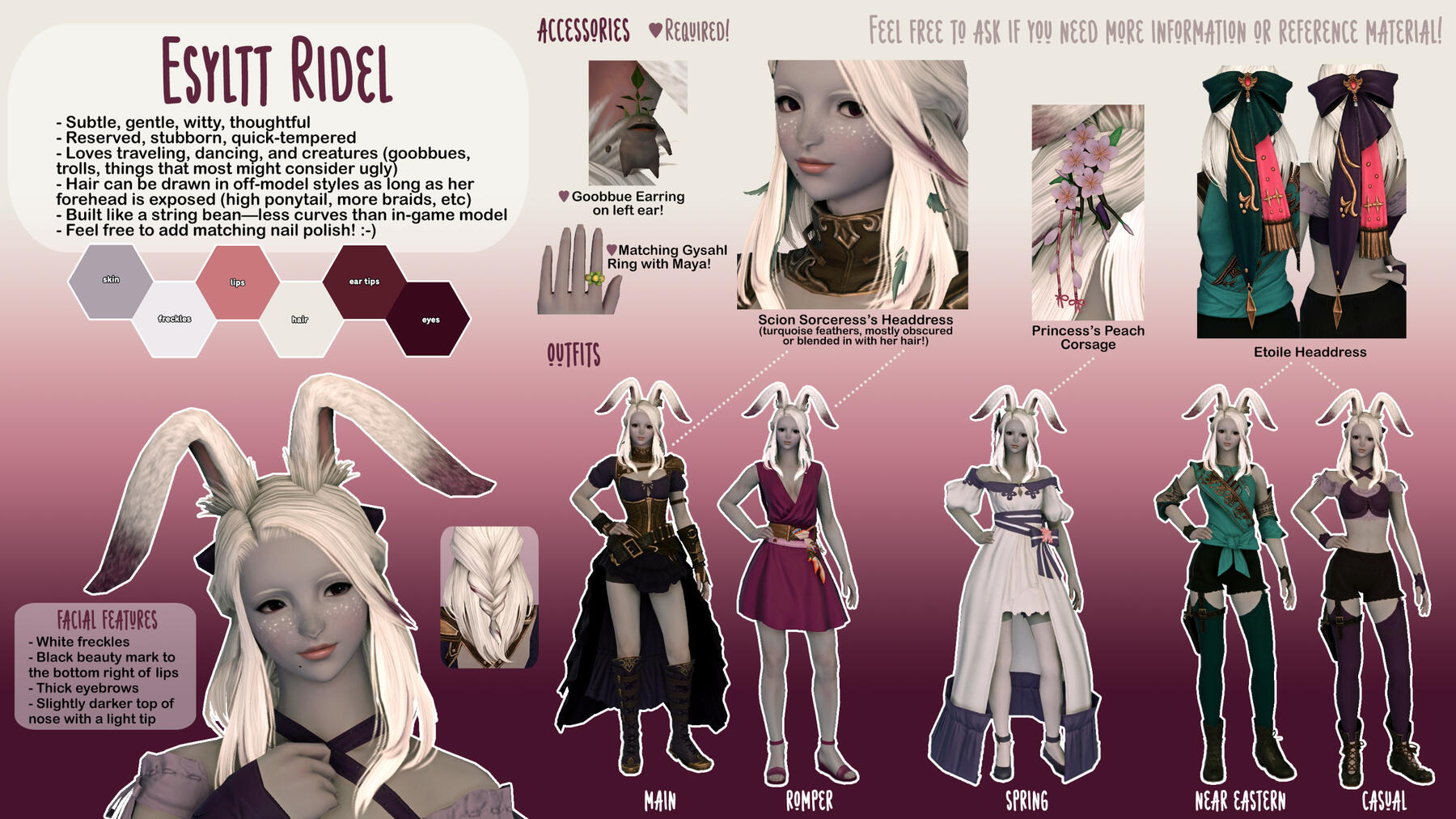 A thoughtful and compassionate soul who left the relative comfort of her home in the Skatay Range to find meaning in life beyond of the rigidity of a traditional Viera society. A need for stability and a latent, inexplicable pull brought her to Eorzea, and soon enough, she found herself in the shoes of heroes of legend. The horrors persist, but so does she.